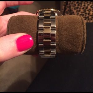 Gold and silver Michael kors watch. Needs new battery comes with link and pin that was taken out for sizing band has normal wear scuffs on it no scratch on anything on face of watch