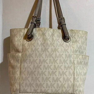 Michael kors white & gray MK signature print canvas shoulder handbag with silver tone hardware main 3 compartment zip closure at center 5 pockets at interior wall 1 zip closure jacquard fabric lining hangtag at side logo at hardware pocket at both sides exterior have minor marks stains hight 9.5” width 14” depth 5” strap drop 10”