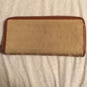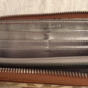 Brown leather wallet. 10 slots. 2 cash departments. 4 card departments. Middle coin slot. Zipper closure. Slight scratches on the metal parts. Slight discoloration on the fabric.