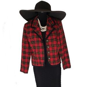 Michael B Ltd Women's Red Black Petite Plaid Button-Up Acrylic Blazer Jacket 10