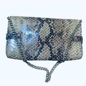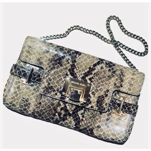 Beautifully embossed python leather, signature lined jacquard interior, full slip back pocket, chain strap, turn key and flap closure, signature logo