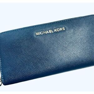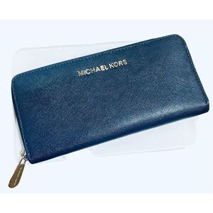 Michael Kors, Continental jet set wallet, Saffiano leather,  3/4 zip gold hardware, detachable wristlet wristlet, credit card, coin and cash lot and signature logo