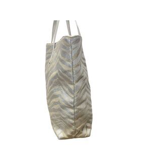 Metallic animal print canvas tote, double handles, leather trim, durable and stylish with signature logo