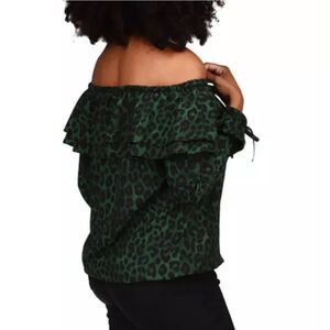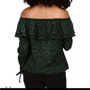 Michael Kors Amazon Green Leopard Print Sexy Off the Shoulder Sateen Blouse