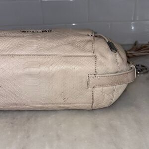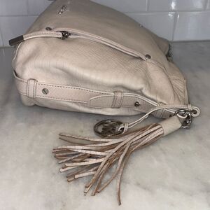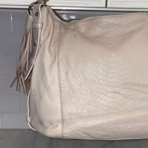 Michael Kors designer Vanilla Leather Convertible Crossbody Shoulder Bag. The bag is a light, creamy "Vanilla" color, made from pebbled leather, embossed with a snakeskin print. It features a hobo-style silhouette with a slouchy, relaxed shape. The bag has a top zip closure for the main compartment. Silver-tone hardware is present, including the chain links connecting the strap to the bag and decorative studs on the front. A prominent silver-tone "MK" logo charm hangs from one side, accompanied by a long, matching leather tassel. It includes a single shoulder strap, convertible to a crossbody style, with a reported 6-inch drop for the shoulder strap. The interior contains a main compartment with multiple pockets for organization. The bag measures approximately 12 inches in height, 14 inches in width, and 4 inches in depth. Photos are the most accurate description of this beautiful leather MK bag. Zoom on photos, ask questions and make an offer!