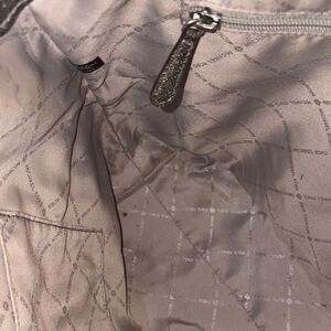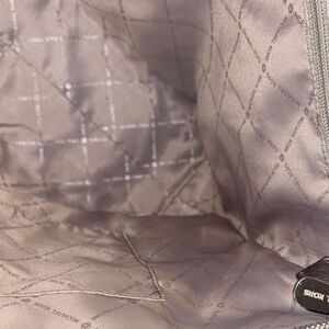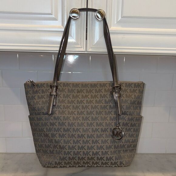Michael Kors designer Charlotte tote bag, from the Jet Set collection, featuring the brand's signature "MK" monogram print in a grey hue. The bag has a structured silhouette with a wide base and tapers slightly towards the top, equipped with two metallic silver sturdy shoulder straps with metallic hardware accents. Handles are in outstanding condition. The exterior displays the repeating "MK" logo pattern throughout the main body and the two large EW slip pockets on each side of the bag, providing accessible storage. Silver medallion is brand new and was just taken out of the original packaging. A prominent circular Michael Kors logo charm hangs from one of the strap bases, adding a distinctive brand element. The bag has a top zipper closure for the main compartment and potentially multiple interior pockets for organization, including a zippered pocket and card slots, as suggested by similar models. The overall design combines functionality with the recognizable aesthetic of the Michael Kors brand. Approximate measurements - 15" x 11.5" x 4.5" Adjustable Handle drop - 8"-10" Photos are the most accurate description of this EUC bag. Zoom on photos, ask questions. Next day shipping!!