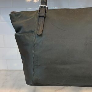 Elegant Designer Michael Kors nylon tote in dark greenish gray. Features sturdy handles and signature logo charm. Perfect for daily use. Side east west slip pockets for easy access. Zipper top protects tan fabric interior with slip pockets and a zipper pocket. Bag needs some love. This is a rehab project bag that requires a deep cleaning. It is priced accordingly. It’s an opportunity to grab a great deal and fix up this diamond in the rough.