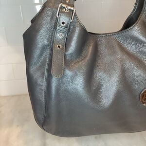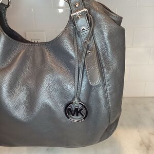 Authentic Michael Kors Bedford Belted Black Leather Satchel Shoulder Bag Handbag in EUC. Charcoal grey in pebbled leather is elevated from the ordinary black bag! Neutral and goes with everything!! Experience the refined elegance of the Michael Kors Gray and Silver Shoulder Bag, crafted with a structured silhouette that exudes sophistication. This stylish accessory combines the brand's signature luxury with a versatile design, perfect for elevating any ensemble. Its premium finish and chic color palette ensure a timeless appeal. The bag is about 16.5"W x 9.5"H x 9.5"D with an 8" handle drop. It's a popular style, often referred to as an "urban essential" and "perfect everyday piece," according to Michael Kors descriptions. Photos are the best description of this stunning MK bag. Please ask questions and make an offer!!