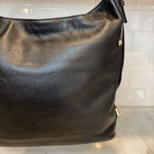 Authentic Michael Kors Bedford Large Belted Leather Hobo Shoulder Bag in EUC. This Michael Kors hobo bag in black leather features a relaxed, slouchy silhouette with a single curved shoulder strap. The soft, pebbled leather and minimalist design make it a versatile accessory for everyday use.