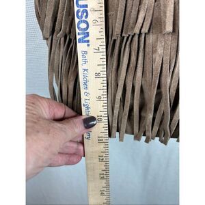 Boho western charm meets luxury with this Michael Kors taupe suede fringe crossbody bag. Designed with layered fringe detailing, silver-tone stud embellishments, and a soft suede finish, this piece adds a touch of free-spirited sophistication to any outfit.
