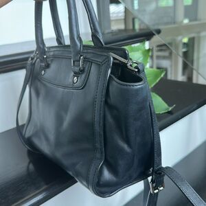 Chic and versatile Michael Kors satchel in black genuine leather with quilted stud detailing on the front panel. This structured handbag features dual top handles and an adjustable/removable crossbody strap for hands-free convenience. The exterior has a sleek smooth leather back and the interior is spacious enough for everyday essentials. Zip-top closure keeps everything secure.