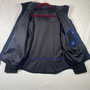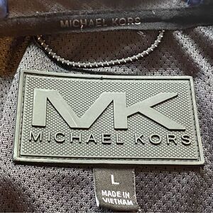 Michael Kors Black Soft Shell Hooded Jacket Size Large. Great pre-owned condition. Front zipper closure. Drawstring at bottom and hood. Large zippered front pockets. Cuffs adjustable with hook and loop closure. Reflective stripes on hood, sleeves and back. 100% polyester and machine washable. Measures approximately chest 44", length 27", sleeve 26".