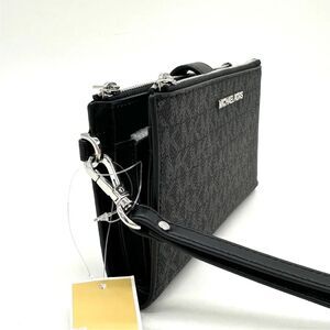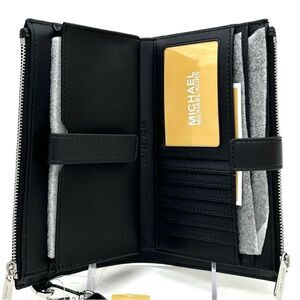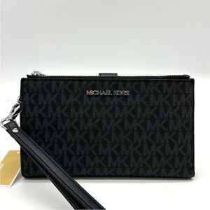 Stylish Michael Kors wristlet wallet in black. Features signature MK pattern and silver hardware. Perfect for on-the-go use. this item no longer has tags. it was used twice. it wasn't my style.