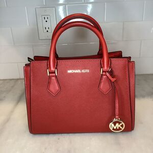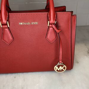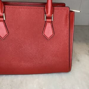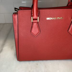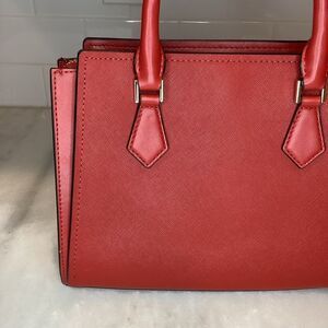 Authentic Michael Kors Camille Candy Apple Red Convertible Saffiano Leather Satchel EUC. MK satchel in a vibrant red hue is crafted from durable saffiano leather, offering a sophisticated and timeless design. The structured silhouette and double top handles make it a versatile accessory for any occasion. Its elegant sheen and signature charm add a touch of luxury to your ensemble. Gold hardware is the perfect combo. Center zip compartment and multiple interior pockets for organization. No long strap. Measures approximately 10-1/2"W x 7-1/4"H x 4"D. Photos are the best description of this like new beauty. Please ask questions and make an offer!!