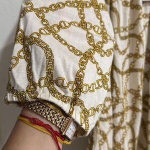 Chic blouse with chain print. Cream base with gold accents. Perfect for stylish outings.