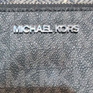 Elegant charcoal wristlet with logo detail. Includes a convenient wrist strap.