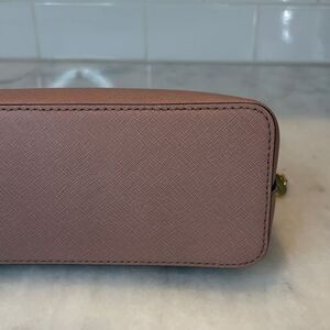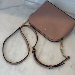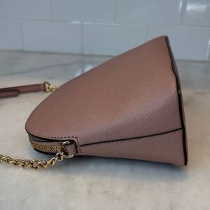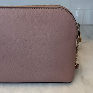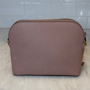 Authentic designer Michael Kors Saffiano Leather Domed Chain-link Crossbody Bag in EUC. Chic and stylish, this Michael Kors crossbody bag in dusty pink is perfect for any occasion. Its elegant design and gold accents make it a must-have accessory. Dome shaped structured bag is a perfect size for all of your necessities. Gold hardware and gold chain accent on the matching leather adjustable crossbody strap. Full slip compartment on the back of the bag for easy access. Zipper top protects tan interior with a slip pocket and a zipper pocket. Approximate size - 8.75" x 7" x 3.5" Adjustable strap - 22" - 27" Photos are the most accurate description. Zoom on photos, ask questions and make an offer!!