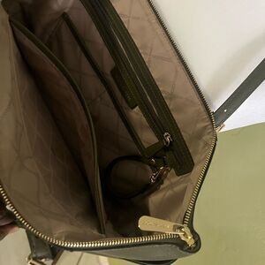 Chic and versatile dark green tote by Michael Kors. Features sleek design and signature logo charm.