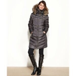 Michael Kors Faux Fur Trim Down Gunmetal Coat XS