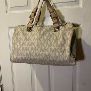 Michael Kors Grayson Satchel Monogram cream and tan straps gold tone hardwares.Top zipper the inside lining has a side zipper two side pockets. Pre owned in good used condition small transfer marks on the lining. See all pictures any questions please message.