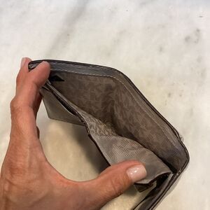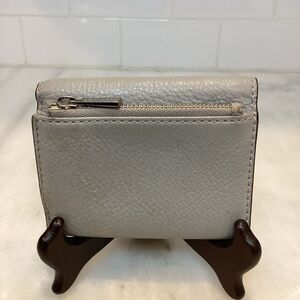 It's a compact, bifold card case wallet crafted from pebbled leather, featuring a snap closure and the Michael Kors logo on the front. It includes multiple card slips, a larger slip pocket, and potentially a clear ID slip depending on the specific model, along with a billfold slip along the upper edge. Made from pebbled leather, known for its durability and textured feel. Stylish gray leather wallet by Michael Kors. Compact and elegant design. Outer zipper compartment.