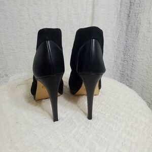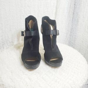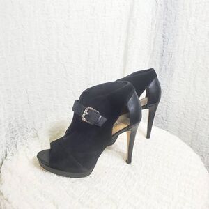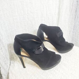 MICHAEL Michael Kors Black Isabella suede ankle boots featuring open toe, V neck and buckled strap. Stilleto heels. Pre-owned in good condition. Please refer to pictures for best description, and condition verification.