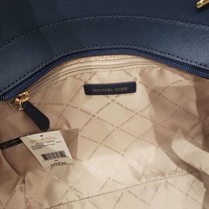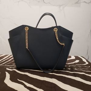 Check out my closet for more Limited Edition Polo Bear, Polo Ralph Lauren, Michael Kors, Kate Spade & AldoThis listing features a Michael Kors JST Large Chain Shoulder Tote in navy. Crafted from signature MK coated canvas and genuine saffiano leather, it includes gold-tone hardware. Dimensions are approximately 9.5" H x 15.6" W (widest point) x 4.5" D, with a 10.5" W base. The bag features an attached MK emblem charm, a fabric-lined interior with two slip pockets and one zippered pocket, and two exterior pockets. The handle has an approximate 10" drop and is constructed of chain and leather. The price is firm. Please review my closet for additional limited-edition Polo Bear, Polo Ralph Lauren, Michael Kors, Kate Spade, and Aldo items.