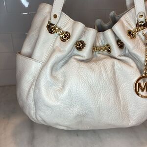 Authentic Michael Kors Jet Set Chain Ring Tote Vanilla Cream Genuine Pebbled Leather EUC. This Michael Kors shoulder bag in a pristine cream hue features a stylish ruched design, offering a chic and modern look. A gleaming metallic chain creates the slightly gathered silhouette of a sophisticated tote fashioned from rich, pebbled leather. Crafted from high-quality leather, it boasts a slouchy silhouette and a comfortable curved shoulder strap, making it a versatile accessory for any occasion. The gold-toned hardware and signature MK medallion add a touch of elegance to this timeless piece. Photos are the best description of this MK bag. Please ask questions and make an offer!!