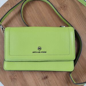 The Michael Kors Jet Set Small Pebbled Leather Smartphone Convertible Crossbody Bag is a stylish and practical accessory designed for women. Crafted from green pebbled leather, this small bag features a gold hardware color and a removable crossbody strap for versatility. The interior includes credit card slots, making it perfect for on-the-go use. With its solid pattern and classic designer theme, this bag from the Michael Kors Jet Set collection is a timeless and chic addition to any wardrobe.