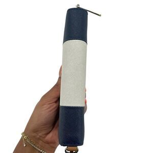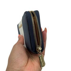 Michael Kors wristlet wallet, Jet Set Travel Continental, Navy blue MK wallet, Zip around wallet with strap, Designer coated canvas wallet, Stripe wallet Michael Kors, Compact wallet with card slot, Michael Kors wallet navy white, Preloved designer wallet, Detachable strap wallet