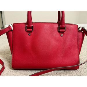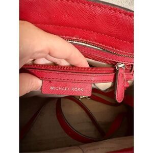 Michael Kors Leather Selma Red Tote Satchel Medium with silver hardware. Good used condition some stains and the leather has softened on the front so it’s not as stiff.