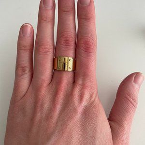 This Michael Kors logo plate ring (size 8) is used but in really good condition. The plate itself is still very nice without any huge markings or scuffs (see photos as part of the ring's description). The inside of the band is a little scuffed up from wear over time (see photo). This is a comfy ring to wear and a great accent piece! Please reach out with any questions, thanks for looking!