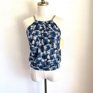 Elevate your swim style with this Michael Kors tankini top featuring a chic palm mix print and high-neck blouson silhouette. The banded hem offers a secure fit while the loose shape flatters the midsection. In New Navy and size Small, it’s perfect for pairing with matching or neutral bottoms. Effortless resort-ready style.