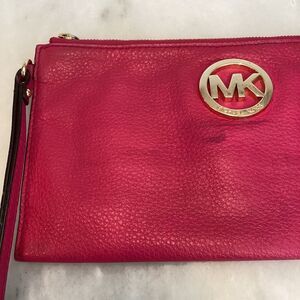 Authentic Michael Kors Pebbled Leather Clutch with Metallic Logo in preloved condition. This elegant Michael Kors clutch in a vibrant pink hue is crafted from high-quality materials and features the iconic metallic MK logo. Its compact design makes it perfect for carrying essentials with style and sophistication. Tan interior with card holder slots and slip pocket. Photos are the best description of this preloved clutch wristlet. Approx. 10" x 5.5" Make an offer!