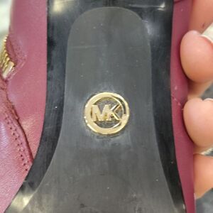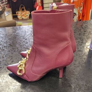 These Michael Kors heeled boots showcase a chic pink leather design with a pointed toe and a sleek stiletto heel. The standout feature is the gold chain detail across the toe, adding a touch of glamour to the modern silhouette. Perfect for elevating any ensemble with a sophisticated flair.