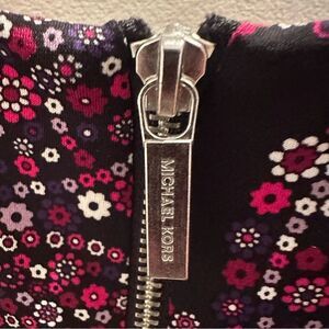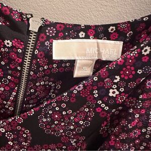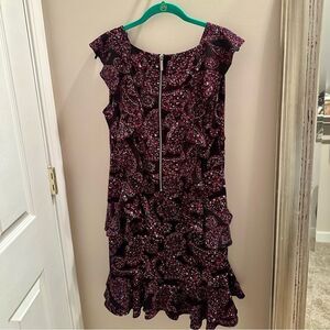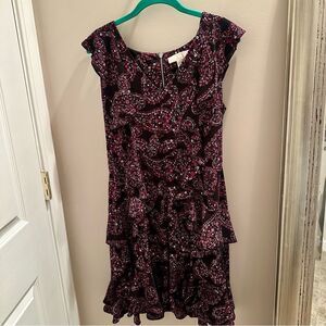 Beautiful sleeveless dress in purple paisley print by Michael Kors with layers of cascading ruffles. V-neckline with back zipper. Polyester and spandex blend. L 35” x W 21” pit to pit.
