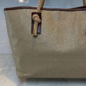 Authentic designer Michael Kors Marina Large Canvas Tote in EUC. This Michael Kors tote bag combines elegance and functionality with its gold and tan color scheme. Crafted with a structured design, it features gold-tone hardware and double top rope handles for a sophisticated look. Chocolate brown leather accents are beautiful. The spacious interior makes it an ideal choice for carrying your essentials in style. Approximate measurements - 15" x 10" x 6" Strap drop -11" Asking $150 on another selling platform. Photos are the most accurate description of this unique bag, zoom, ask questions and make an offer!