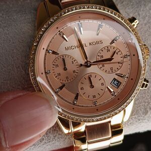 Rose gold-tone chronograph dial with crystal markers, gold-tone stick indices, three hands, three subdials, date window and Michael Kors logo