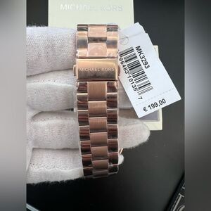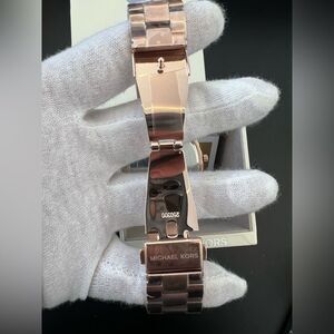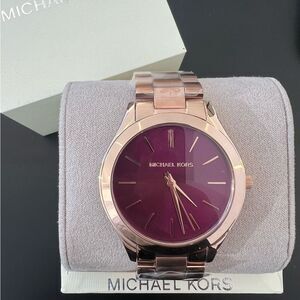 Stylish Michael Kors watch with a rose gold band and deep purple face. Ideal for any event.