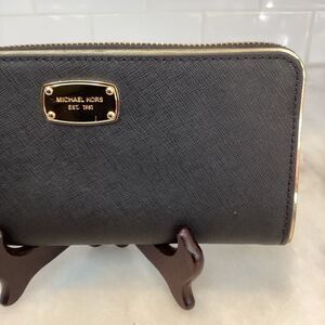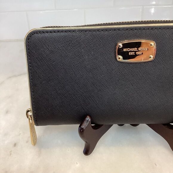 Authentic Michael Kors Saffiano Leather Continental Full Zip-Around Wallet in EUC. Chic black wallet with gold-tone hardware. Zip-around design. Michael Kors logo on front. This is a classic MK wallet that will never go out of style. Approx. 8" x 4" Listed for over $100 on multiple selling platforms. Photos are the best description of this beautiful wallet. Make an offer.