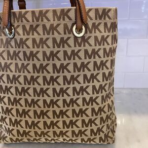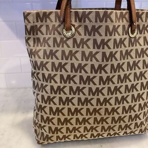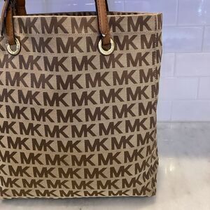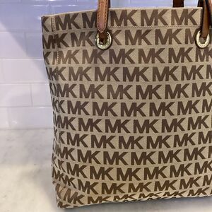 Authentic Michael Kors Canvas Large Shopper Tote in preloved condition. Tan/brown signature logo with tan leather straps and gold hardware. Magnetic snap closure. Chocolate tan logo interior with 4 slip pockets and 1 zipper pocket to organize your belongings. Overall the bag is clean. Adjustable shoulder straps show minor wear. Tote is large enough to carry a laptop. Photos are part of the description, zoom on photos for detailed condition. Approx. 14”x15.5”x3” strap- 9-10” Feel free to ask questions and Make an offer.