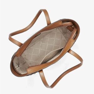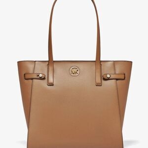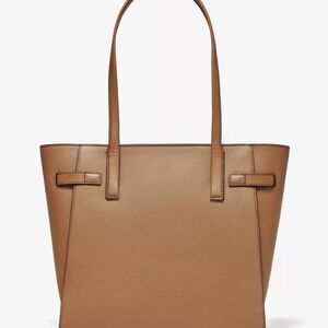 Experience the perfect blend of style and functionality with this Michael Kors Tan Leather Tote. Crafted from high-quality leather, it features a sleek design with a gold-toned emblem for a touch of elegance. The structured lines and sturdy handles make it an ideal choice for everyday use.