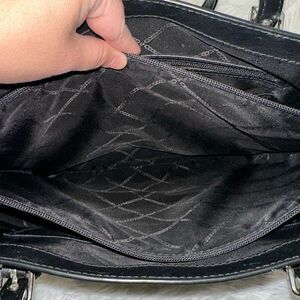 Fabric lined interior features 1 padded center zip divider compartment, back wall zip pocket; 5 slip pockets