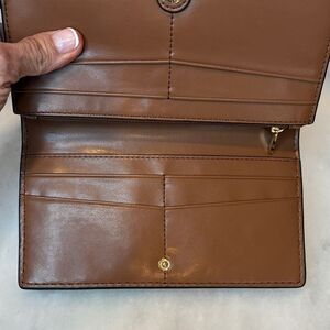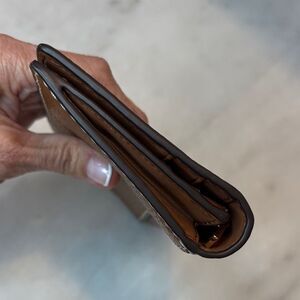 Authentic designer Michael Kors Pebbled Leather Slip Snap Closure Wallet in EUC. This beautiful brown leather wallet has pronounced white stitching that really pops! Gold MK initials on the front of the wallet have no scratches or scuffs. Slip pocket on the back for easy access. Snap closure protects matching smooth leather interior with card slots, cash slot and a zipper compartment. Approximate measurements - 7.5" x 4" Photos are the most accurate description of this classic light weight slim wallet. Ask questions and make an offer!