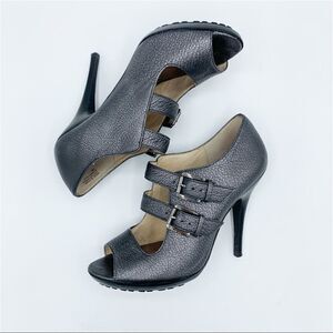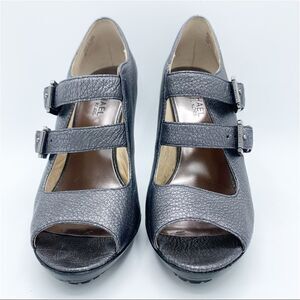Fun metallic buckle heels from Micheal Michael Kors. Double buckle straps across top of foot, while another strap crosses the toes -- these heels are so easy to walk in because your foot is so secure! Rubber sole for added comfort and grip. Shiny, gunmetal gray with gunmetal buckles. Subtle textured patterning on leather. Great work to evening shoes. Slight lugged platform adds an edgy vibe. Slight toe impression on one shoe. Please see photos for additional details.