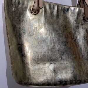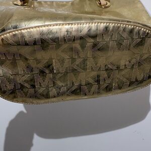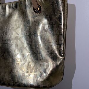 Michael Kors Women's Gold Monogram Logo Metallic Mirror Jet Set Tote Bag Medium