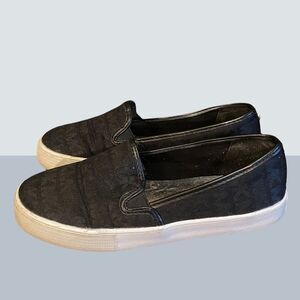 Cute! pair of girl's MICHAEL Michael Kors "Audrey", slip-on, signature, black loafers.