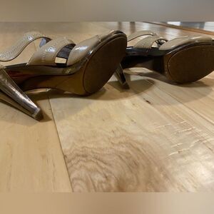 Gold shiny heel. Most wear is around the front sole on the sides and on the back of the heels. See pics.
