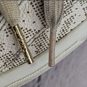 **Please see pics. Gold emblem is missing from back of right shoe. Gold aglet is missing off one end of left shoelace as shown in pics. Not very noticeable.