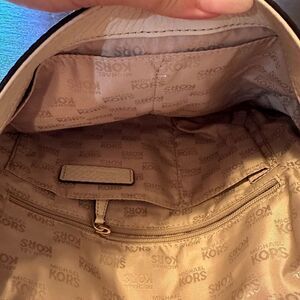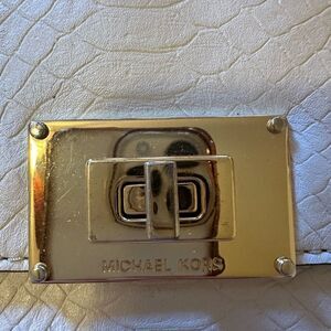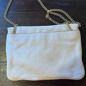 Beautiful leather bag! Over the shoulder with gold chain strap. It’s a great size! Cream, alligator pattern leather. Inside is very clean! One zippered pouch and four slip pockets. There are a couple marks see the picture but they are hardly noticeable. The bottom is a little worn on one side. Approximate measurements: